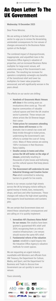 We are writing on behalf of the live events sector to urge you to review the devastating, unintended consequences for live venues of changes announced to the Business Rates system at the Budget.